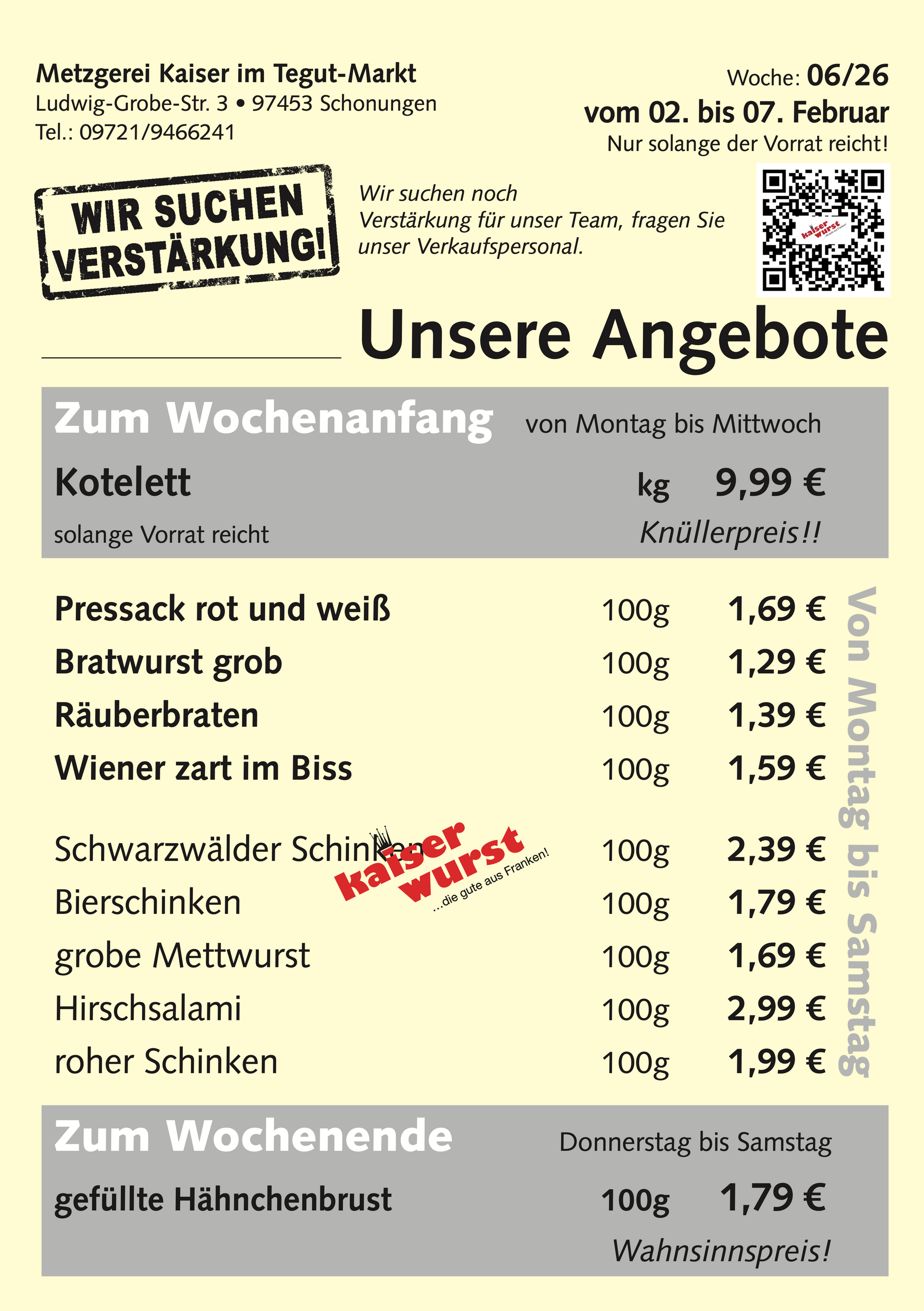 Besuchen Sie unsere Filiale in Schonungen in der Ludwig-Grobe-Straße 3 und erleben Sie unsere Auswahl an hochwertigen Fleisch- und Wurstwaren. Wir sind stolz darauf, Ihnen Frische, Qualität und Geschmack zu bieten. Wir freuen uns auf Ihren Besuch!